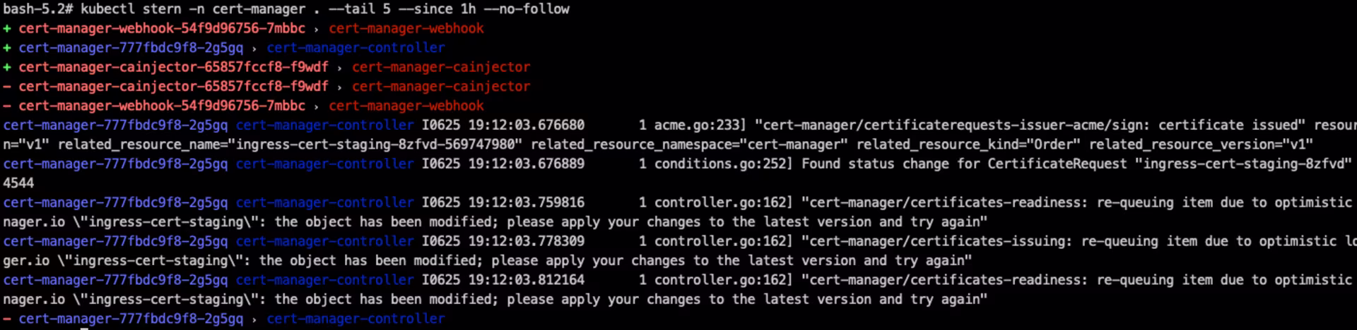 kubectl stern -n cert-manager . --tail 5 --since 1h --no-follow